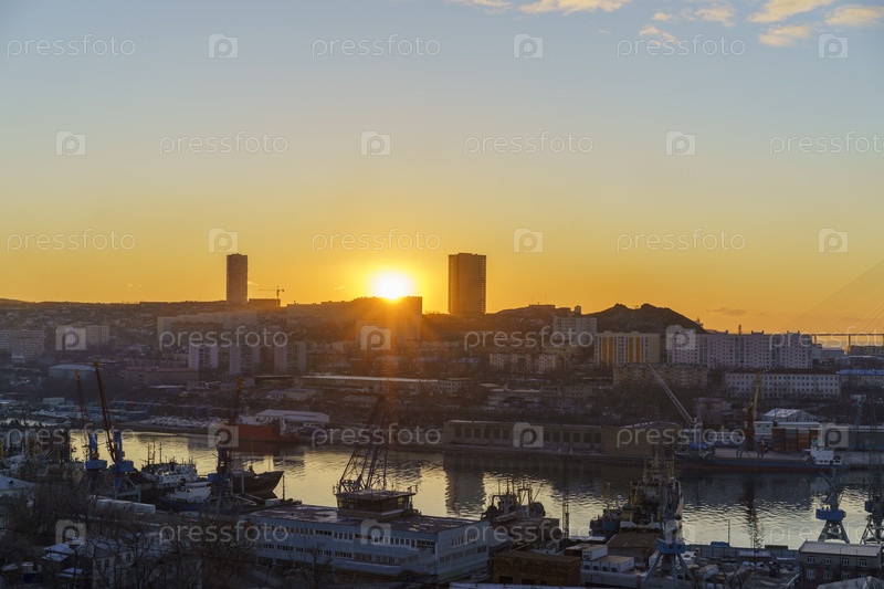 Городской пейзаж с видом на порт Диомид на рассвете. Владивосток, Россия