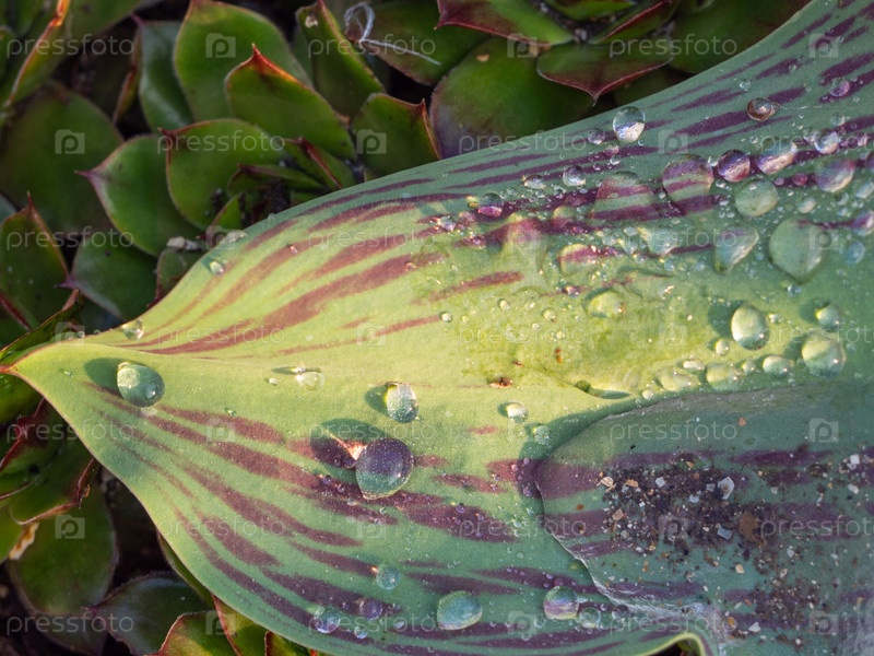Капли воды на зеленый лист крупным планом. Фото макроса яркого листа тюльпана с каплями росы в естественных условиях