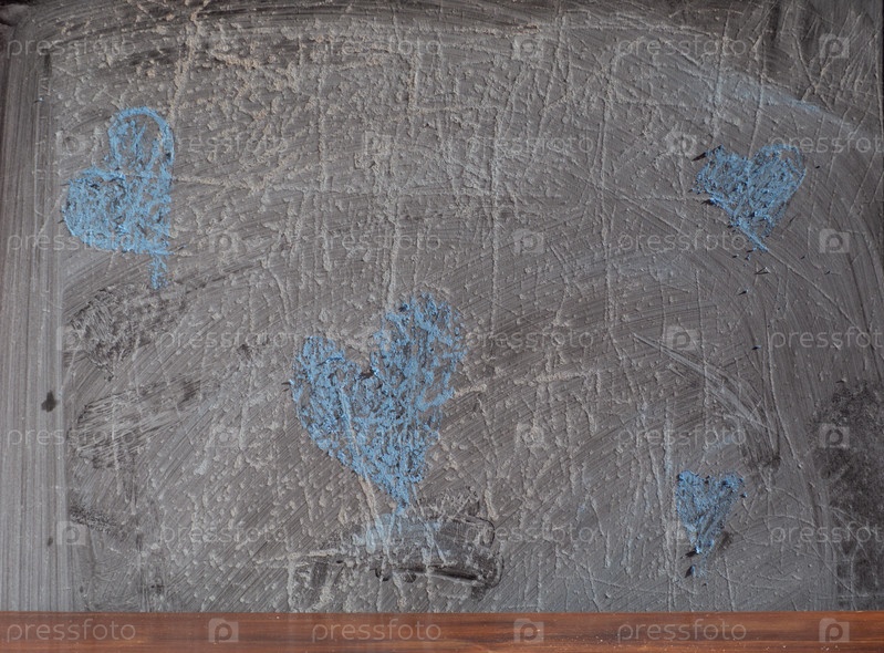 Старая потрепанная доска с сердечками, нарисованными на ней синим мелом