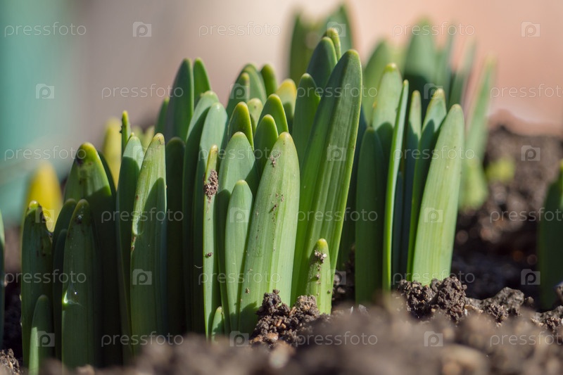 Молодые зеленые цветочные побеги, первая весенняя посадка, садовые работы. Зеленые побеги на черной земле, клумбы. Проросшие весенние цветы нарциссы в саду ранней весной - выборочный фокус, пространство для копирования