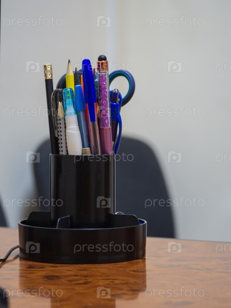 Канцелярские товары в органайзере на рабочем столе. Крупный план органайзера с использованными ручками и карандашами на деревянном столе в офисе. Офисные принадлежности. Ручки в чашке на столе переговоров