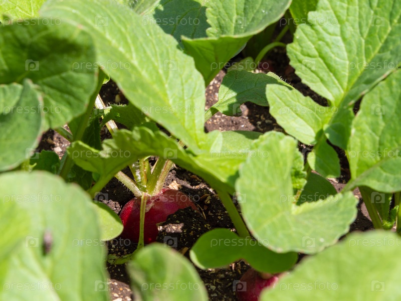 Крупный план красной редьки в земле сквозь листву, малая глубина резкости. Органическая редька растет в земле