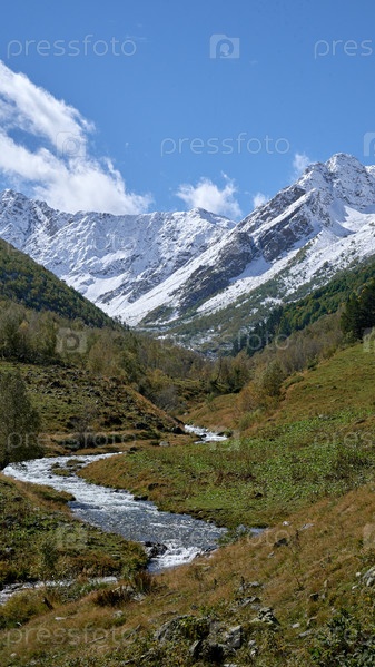 Заснеженные вершины кавказских гор и горная река