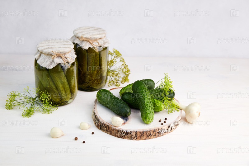 Маринованные огурцы в банках, свежие огурцы, укроп, чеснок на белом деревянном фоне