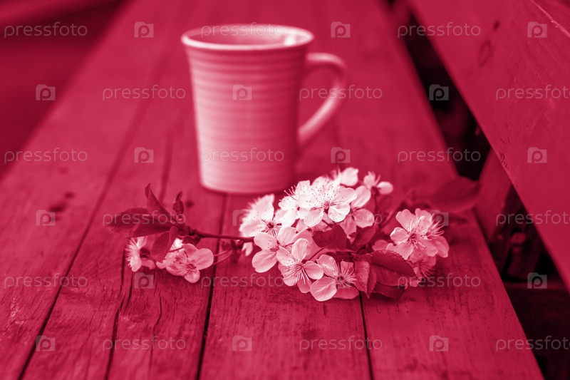 Чашка кофе на темном изношенном деревенском деревянном столе. Композиция украшена веточкой с белыми цветами. Цветы вишневого дерева. Выборочный фокус