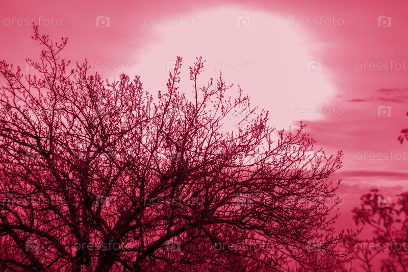 Красивый вид на заходящее солнце сквозь ветви дерева. Ветки раскидистые