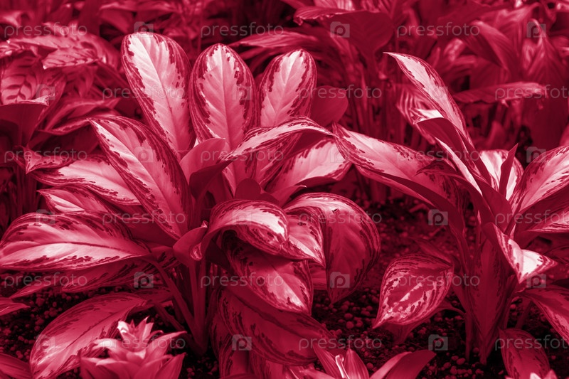 Клумба с аглаонемой Сильвер Кинг в весеннем саду. Тропическое растение «Аглаонема Сильвер Бэй» или «Серебряный король», также известное как «китайские вечнозеленые растения»