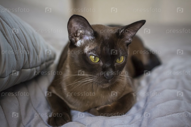 Крупный план бирманской кошки дома. Портрет молодой красивой коричневой кошки