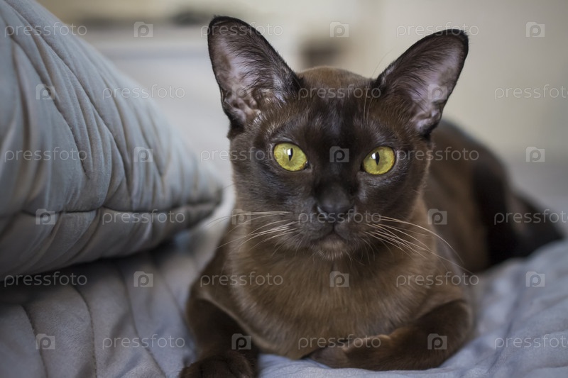 Крупный план бирманской кошки дома. Портрет молодой красивой коричневой кошки