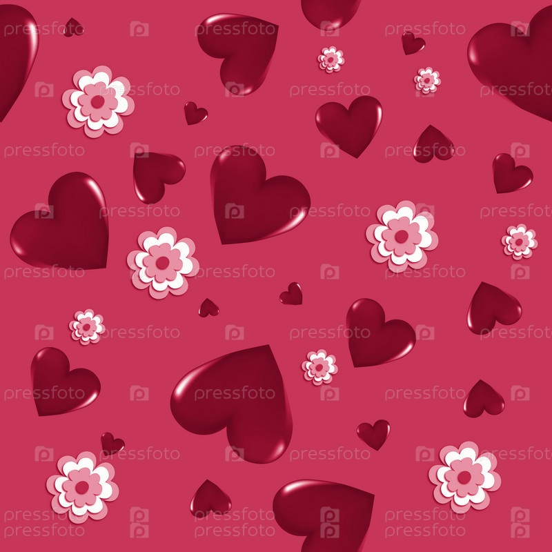 Красные 3D-сердца и розовые цветы на цветном фоне Бесшовный фон Стильные творческие обои