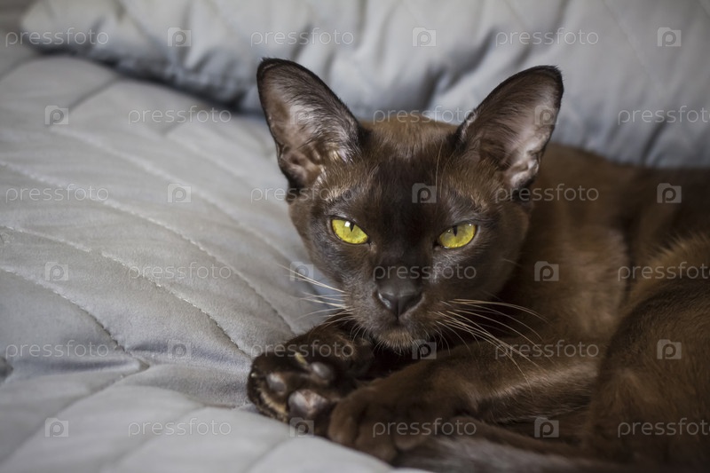 Крупный план бирманской кошки дома. Портрет молодой красивой коричневой кошки