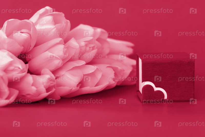 Букет свежих желтых тюльпанов на красном фоне. Небольшая подарочная коробка рядом с тюльпанами. Весенние цветы. Концепция весны или праздника, 8 марта, Международный женский день,
