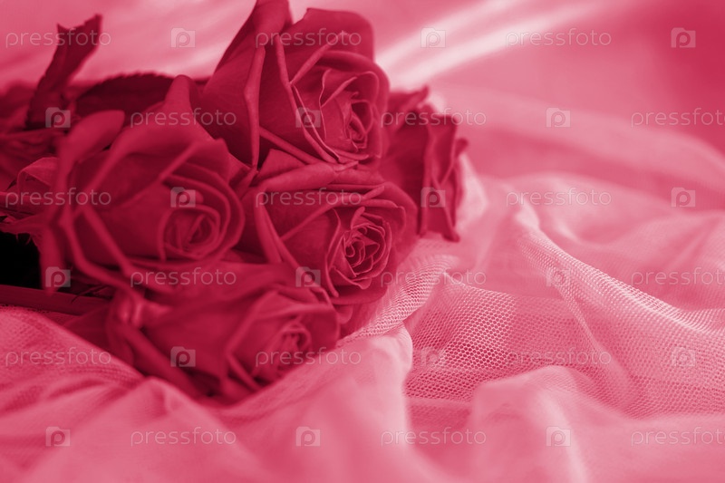 Композиция с букетом розовых роз на фоне нежной ткани. Праздничный подарок, пастельные тона. Праздничный нежный фон, день рождения, свадебный букет. Поздравительная открытка ко Дню святого Валентина