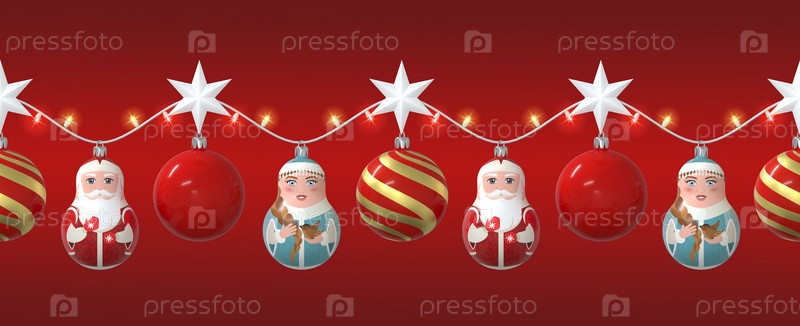 Бесшовная светящаяся гирлянда из белых звезд, красных елочных шаров, игрушек Деда Мороза и Снегурочки