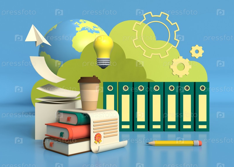 3D-визуализация книг, офисных папок, документов и других символов современного дизайна