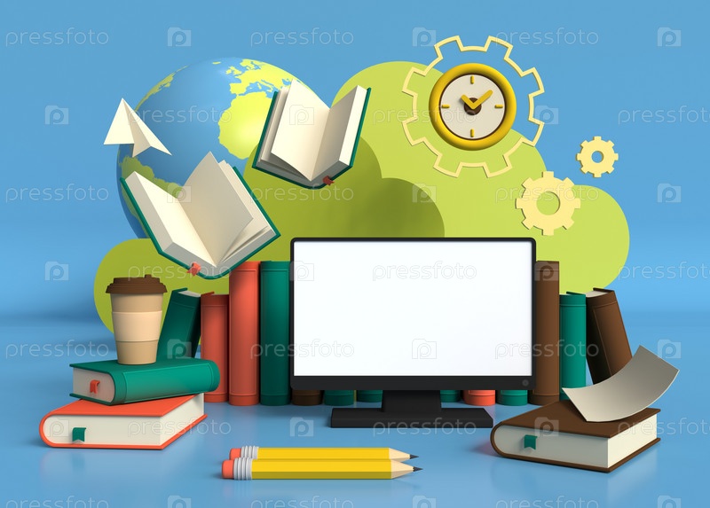Библиотека. Компьютер окружен книгами, открытыми, левитирующими и сложенными стопкой