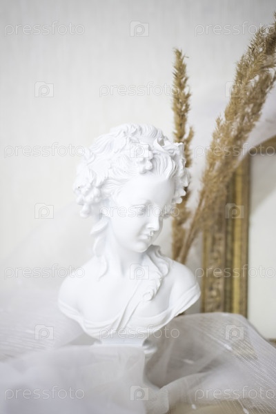 Гипсовый бюст девушки. Статуэтка на фоне легкой ткани и пушистых веток