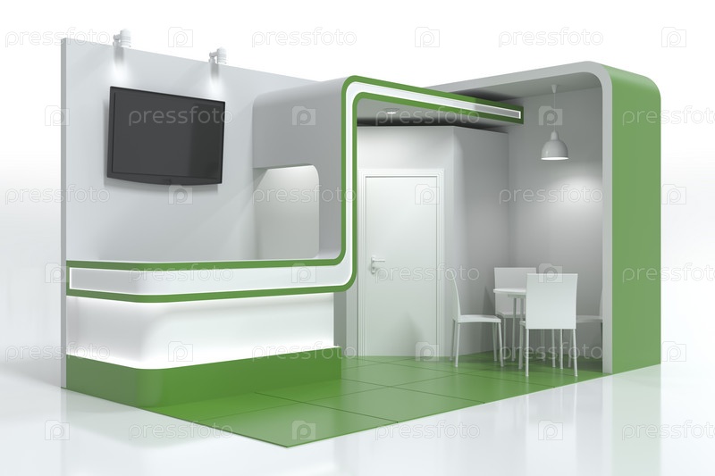 Выставочный стенд белого цвета с бирюзовыми деталями. Пустой стенд для брендинга