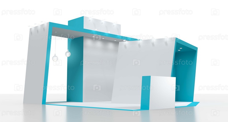 Выставочный стенд белого цвета с бирюзовыми деталями. Пустой стенд для брендинга