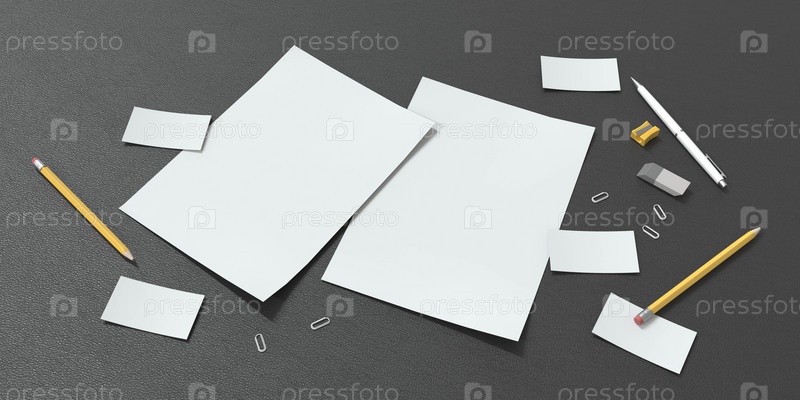 Пустой макет двух листовок и нескольких визитных карточек на фоне черной кожи