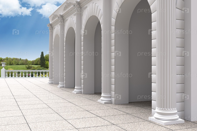 Белой архитектура с арками на фоне голубого неба с зелеными насаждениями
