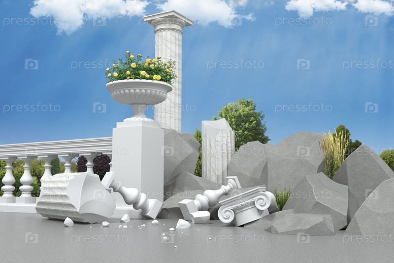 Белая балюстрада с уличными вазами с цветами на фоне колонн и руин из белого мрамора