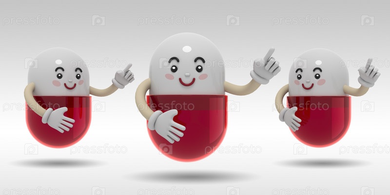 Медицинский персонаж с мимикой в трех проекциях. Персонаж улыбается и указывает в сторону