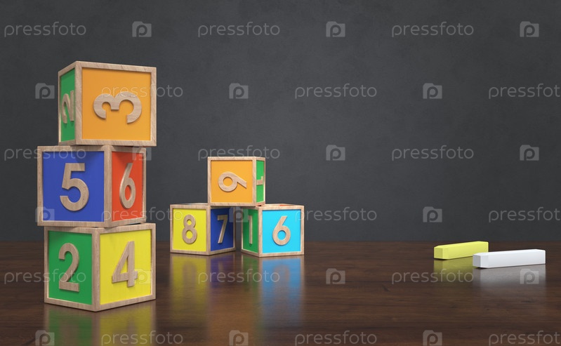Разноцветные деревянные кубики с цифрами и мелом на деревянном столе