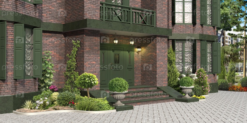 Фасад дома из темного кирпича с зеленой дверью и зелеными насаждениями по бокам от входа