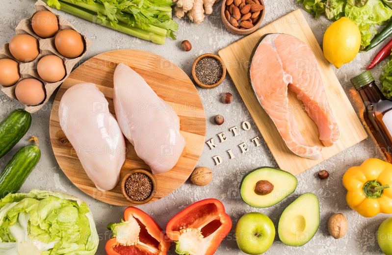 Вид сверху на кето или кетогенную диету на сером фоне. набор здоровых продуктов с высоким содержанием белка и хорошим источником жиров