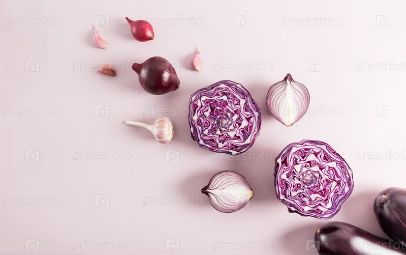 Плоская планировка фиолетовых овощей на фиолетовом фоне. один цвет. вид сверху. копия пространства
