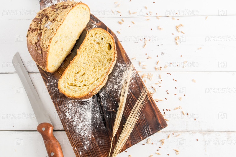 Нарезанная буханка вкусного домашнего хлеба на доске и деревянный белый стол. вид сверху. нож для нарезки хлеба. копия пространства