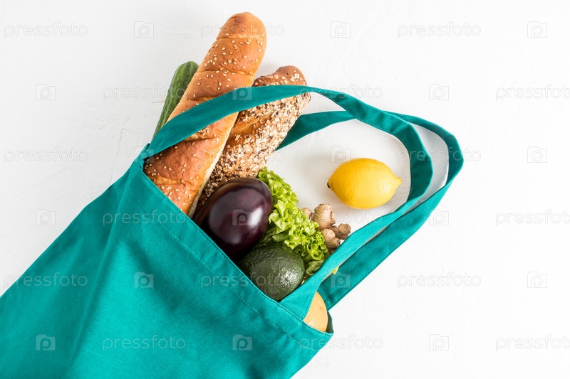 Вид сверху на сумку из холщового экологически чистого материала, наполненную овощами, ю фруктами, веганом. концепция покупки правильной еды