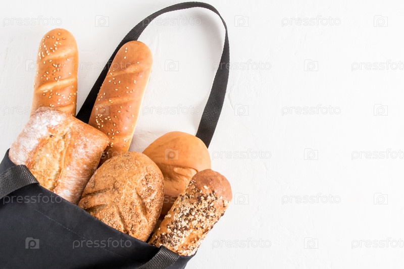 Ассортимент печеного хлеба в черном хлопковом мешке на белом фоне. эко-шопинг концепции органического хлеба. вид сверху