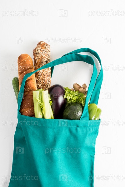 Экологичная сумка для покупок наполнена органическими овощами и продуктами на белом фоне. Концепция покупок в супермаркете