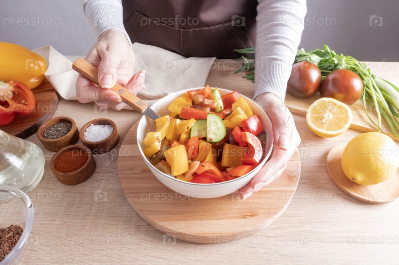 Вкусный органический диетический салат из свежих овощей в большой миске. рука девушки держит вилку с кусочками салата