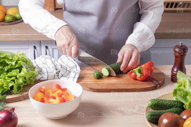 Пожилая женщина в сером фартуке режет свежий зеленый огурец на разделочной доске на современной кухне. приготовление овощного салата
