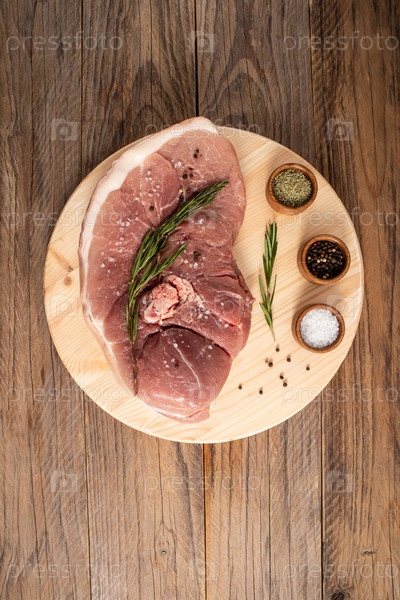 Мякоть свинины на кости лежит на разделочной доске и деревянном столе с веточкой розмарина. Вертикальный вид сверху
