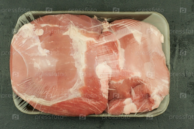 Свежая свиная вырезка на пару на черном пластиковом подносе герметично закрыта. вид сверху. черный фон. Коллекция макетов шаблонов упаковки