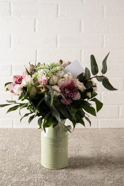Букет свежесрезанных садовых цветов в современной вазе стоит на столе с текстовой карточкой. окончание подарка, внимание близких