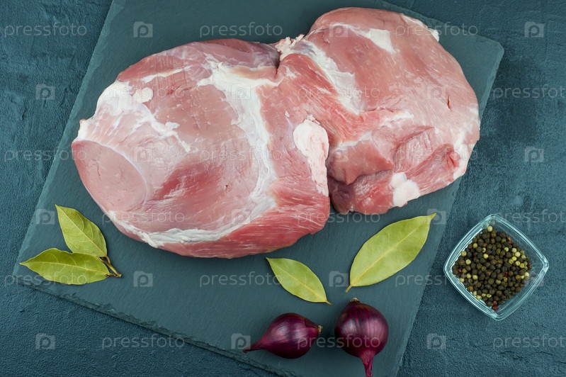 Большой кусок свежего синего мяса на сланцевом камне и черном фоне с лавровым листом, луком и перцем. вид сверху