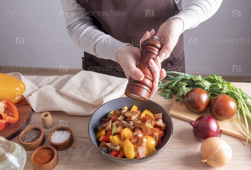 Приготовление вкусной здоровой пищи в домашних условиях. руки молодой девушки посыпают нарезанный салат в миску с перцем с мельницы