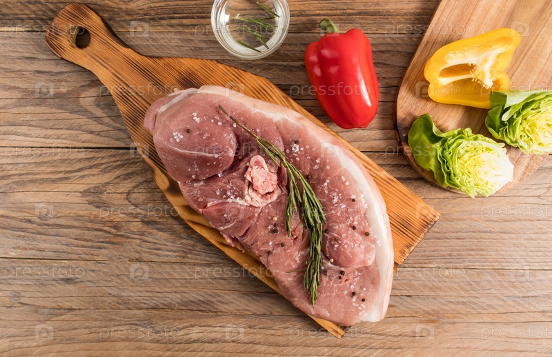 Большой кусок аппетитной свежей свинины на разделочной кухонной доске с овощами для приготовления пищи. вид сверху. деревянный стол