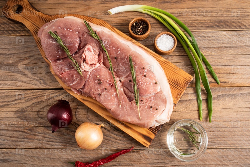 Большой сырой кусок свинины на пару на разделочной доске и деревянный стол со специями. вид сверху. деревенский стиль