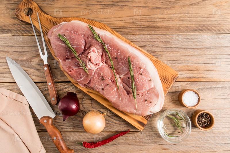 Вид сверху на деревянную доску с большим куском свежего фермерского мяса на деревенском столе. концепция натуральных продуктов