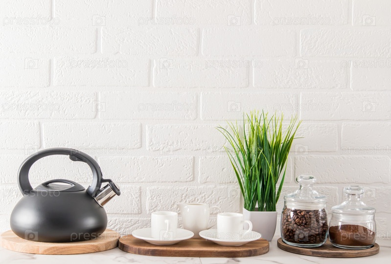 Стильный кухонный фон с предметами для кофейной церемонии. экологически чистые предметы на столешнице на фоне белой кирпичной стены. копия пространства