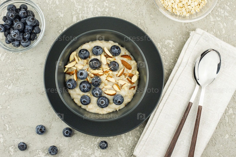 Вид сверху на темную керамическую тарелку с овсянкой, спелой черникой и миндалем. вкусный здоровый завтрак. серый бетонный фон