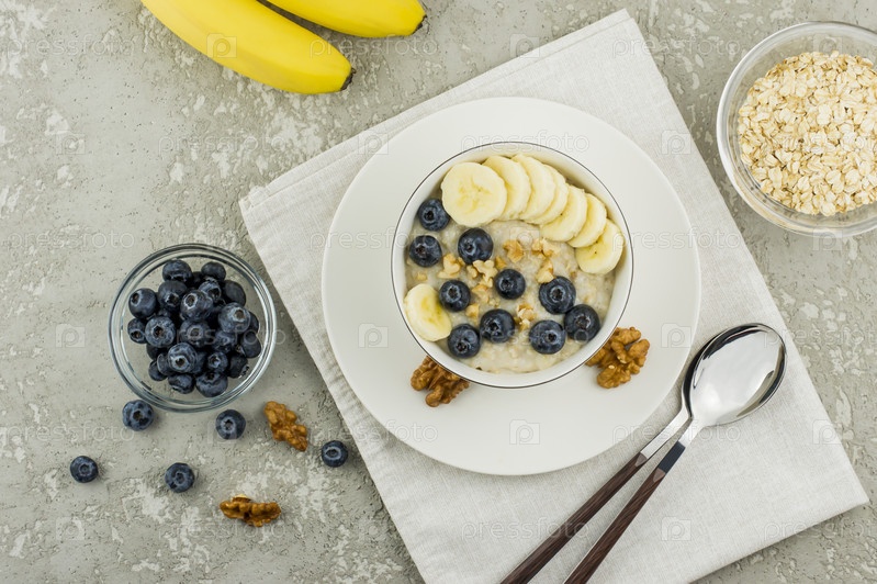 Овсянка с бананом, черникой и грецкими орехами для здорового завтрака. вид сверху