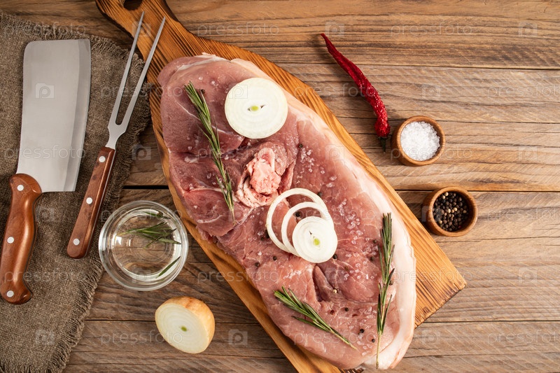 Вид сверху на деревянный стол с большим сырым куском мяса для нарезки посудой и посудой для приготовления пищи. фермерское свежее домашнее мясо