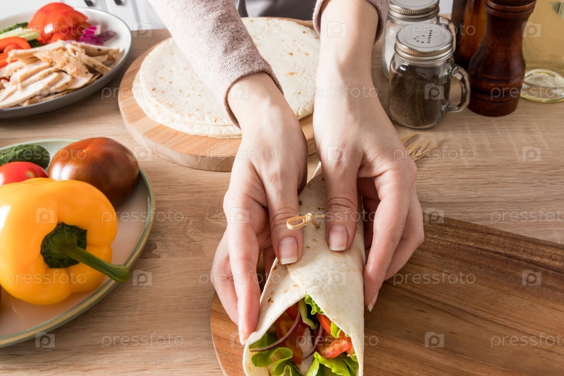 Набор ингредиентов для приготовления буритто, тако. лепешки на гриле, нарезанные кусочки курицы, свежие